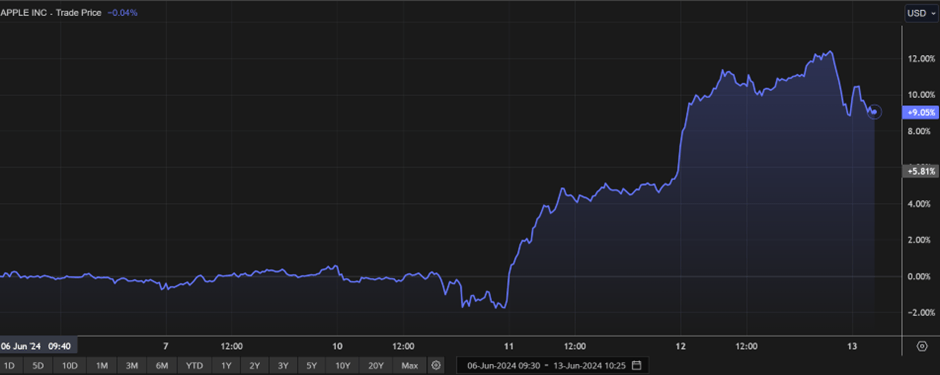 Apple stock was up 9.05% in one week with most of that performance from 11th June to now – after the Apple conference.