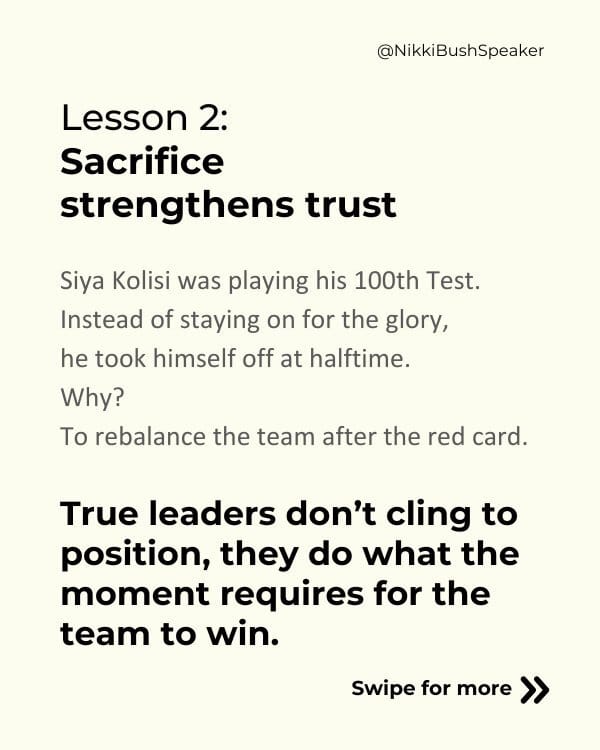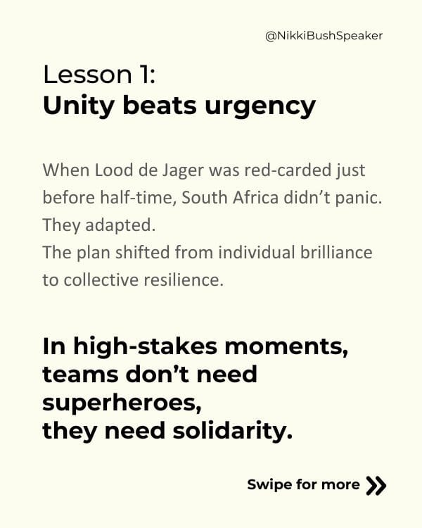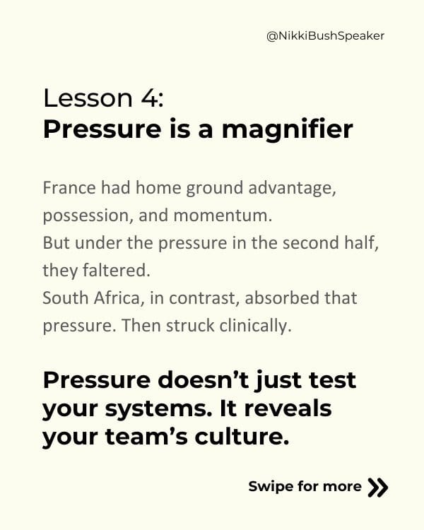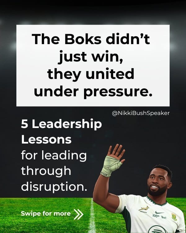 Public Speaker Nikki Bush shared the below, which I thought were great leadership lessons to learn and live by: This past weekend, the Springboks showed us what leadership under pressure really looks like in high-stakes environments where there’s no time to overthink, only time to act with clarity and conviction.