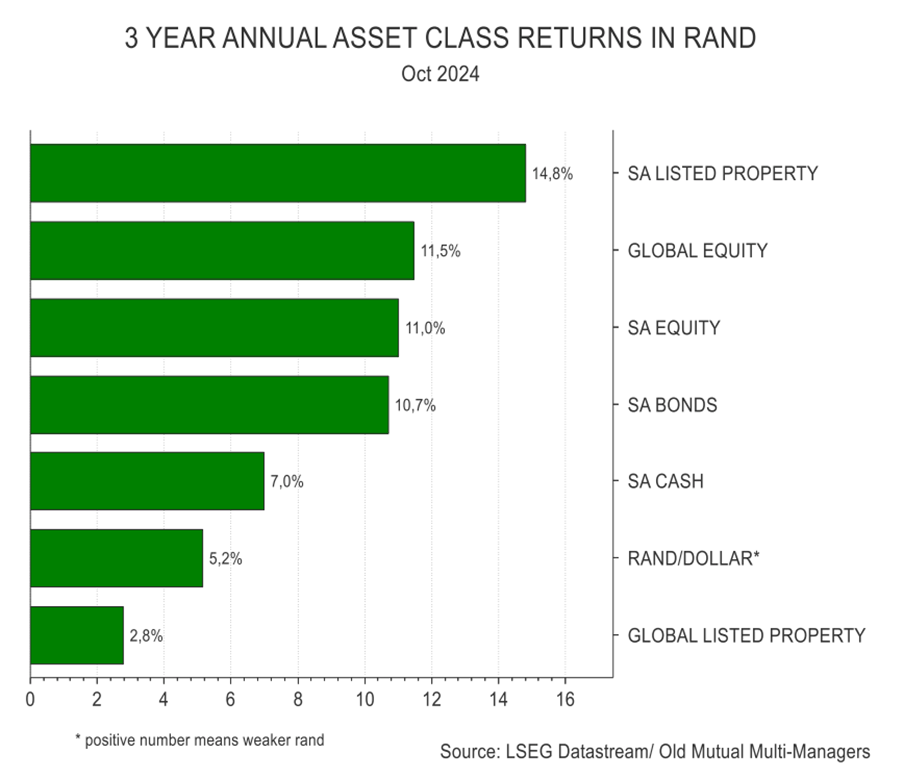 Coming back to us in SA, reviewing the latest asset class returns to the end of October in Rand terms, one-year returns are exceptionally strong.